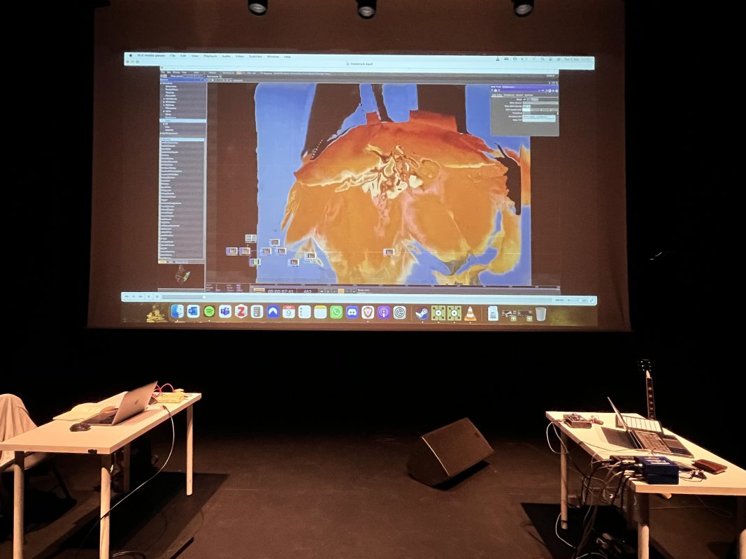 I returned two weeks later to add the audio clips and a visual element with collaborator Keelin Sutcliffe. Keelin was working with natural-world visual material, run through software so it looked deliberately affected but still recognisably organic. We talked about symbols that connected us, and what a bird sees, passes by, or perches on. The result was time-lapses of flowers opening, water, and even an edit of letters sent to Keelin’s father when he lived in Australia. It was an extended tech setup — figuring out how to make this look good and work in real time, while keeping space for the spontaneity of my musical parts.